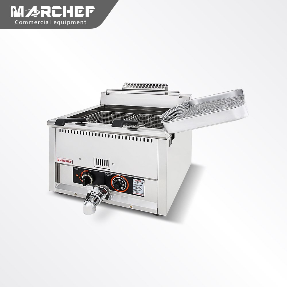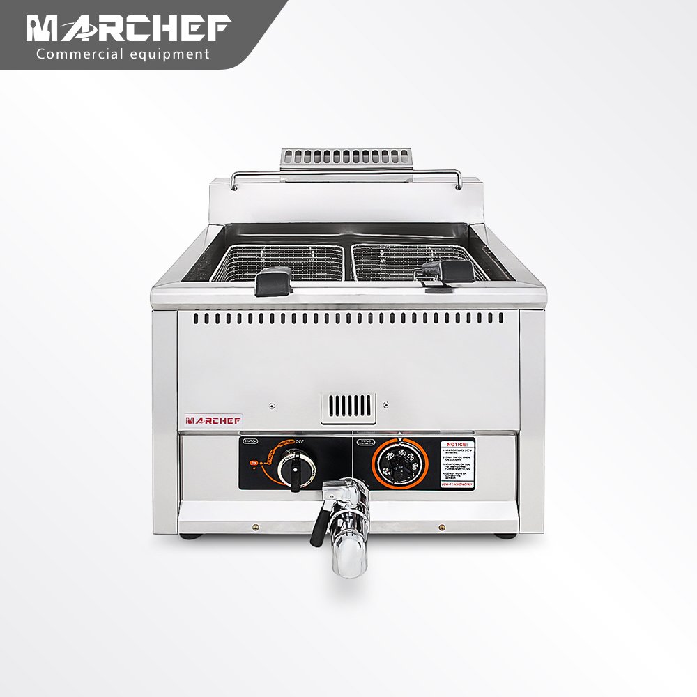 MARCHEF commercial gas fryers are designed for making a variety of crispy fried foods such as French fries, chicken, seafood, etc. Suitable for frozen products. Ideal for restaurants, cafeterias and fast food restaurants. Multiple capacities.